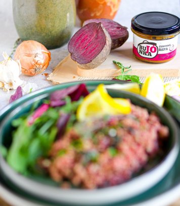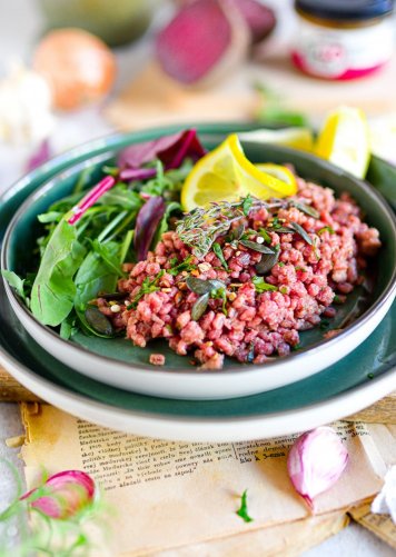 Pripravíme a prepláchneme si krúpy a zatiaľ dáme bokom. Menšiu časť z cvikly nakrájame na malé kocky, z ďalšej pripravíme pyré. Vo väčšom hrnci orestujeme na olivovom oleji nadrobno nakrájanú cibuľku a restujeme cca 5 minút. Potom pridáme nadrobno nakrájaný cesnak restujeme pár minút a pridáme krúpy a restujeme. Zatiaľ si pripravíme zeleninový vývar z bujónky. Do cca litra vriacej vody pridáme 2 PL bujónky z červenej repy a necháme prevrieť. Ďalej pridáme na kocky nakrájanú cviklu, biele víno, citrónovú šťavu, soľ, korenie a bylinky. Restujeme pokým sa nevstrebe biele víno a následne po malých porciách podlievame horúcim vývarom dovtedy kým krúpy nezmäknú. Po 10 minútach varenia primiešame aj cviklové pyré. Po dovarení odstavíme a servírujeme s orieškami, syrom, bylinkami a zeleninou.